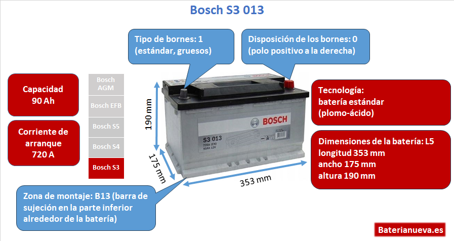 | Bosch S3 | S30 13 | 90 Ah | 720 A | 353x175x190 mm | B13 | Más |